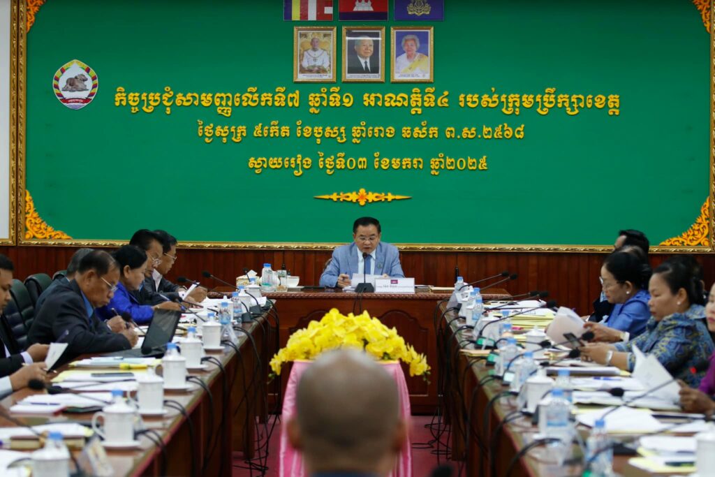នាព្រឹកថ្ងៃសុក្រ៥កើត ខែបុស្ស ឆ្នាំរោង ឆស័ក ព.ស.២៥៦៨ ត្រូវនឹងថ្ងៃទី០៣ ខែមក​រា​ ឆ្នាំ២០២៥នេះ នៅសាលប្រជុំនន្ទីរ អគារ ខ សាលាខេត្ត មានរៀបចំកិច្ចប្រជុំសាមញ្ញ លើកទី៧ ឆ្នាំទី១ អាណត្តិទី៤ របស់ក្រុមប្រឹក្សាខេត្ត ក្រោមអធិបតីភាពឯកឧត្តម ម៉ែន វិបុល ប្រធានក្រុមប្រឹក្សាខេត្តស្វាយរៀង និងមានការអញ្ជើញចូលរួមពីឯកឧត្តម ប៉េង ពោធិ៍សា អភិបាល នៃគណៈអភិបាលខេត្ត ឯកឧត្ដម លោកជំទាវសមាជិក សមាជិកាក្រុមប្រឹក្សាខេត្ត អភិបាលរងខេត្ត លោក លោកស្រី នាយក នាយករងរដ្ឋបាលសាលាខេត្ត លោក លោកស្រីប្រធានមន្ទីរ/អង្គភាពនានាក្នុងខេត្ត តំណាងកងកម្លាំងទាំង៣ លោកអភិបាលក្រុងស្រុកទាំង៨ លោក លោកស្រីនាយក នាយករងទីចាត់ការ/អង្គភាព និងប្រធានការិយាល័យចំណុះសាលាខេត្ត ។