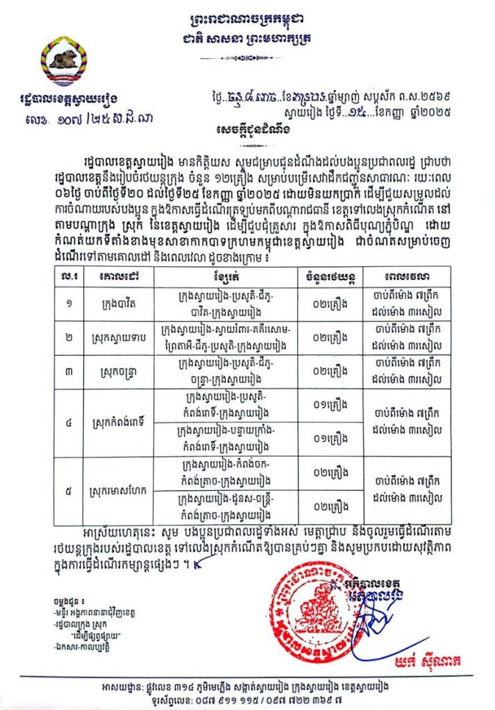 ក្នុងឱកាសឈប់សម្រាកនៃពិធីបុណ្យភ្ជុំបិណ្ឌ រដ្ឋបាលខេត្តស្វាយរៀង បានត្រៀមរថយន្តរួចរាល់សម្រាប់ដឹកជញ្ជូនបងប្អូនប្រជាពលរដ្ឋដោយឥតគិតថ្លៃក្រោមការយកចិត្តទុកដាក់របស់ឯកឧត្ដម ប៉េង ពោធិ៍សា អភិបាលខេត្តស្វាយរៀង រដ្ឋបាលខេត្តនឹងរៀបចំរថយន្តក្រុងចំនួន ១២គ្រឿង សម្រាប់បម្រើសេវាដឹកជញ្ជូនសាធារណៈ រយៈពេល ០៦ថ្ងៃ ចាប់ពីថ្ងៃទី២០ ដល់ថ្ងៃទី២៥ ខែកញ្ញា ឆ្នាំ២០២៥ ដោយមិនយកប្រាក់ ដើម្បីជួយសម្រួលដល់ការចំណាយរបស់បងប្អូន ក្នុងឱកាសធ្វើដំណើរត្រឡប់មកពីបណ្តារាជធានី ខេត្តទៅលេងស្រុកកំណើត នៅ តាមបណ្តាក្រុង ស្រុក នៃខេត្តស្វាយរៀង ដើម្បីជួបជុំគ្រួសារក្នុងឱកាសពិធីបុណ្យភ្ជុំបិណ្ឌ ដោយកំណត់យកទីតាំងខាងមុខសាខាកាកបាទក្រហមកម្ពុជាខេត្តស្វាយរៀង ជាចំណតសម្រាប់ចេញ ដំណើរទៅតាមគោលដៅ និងពេលវេលា ដែលមានលម្អិតក្នុងសេចក្តីជូនដំណឹងខាងក្រោមនេះ ៖